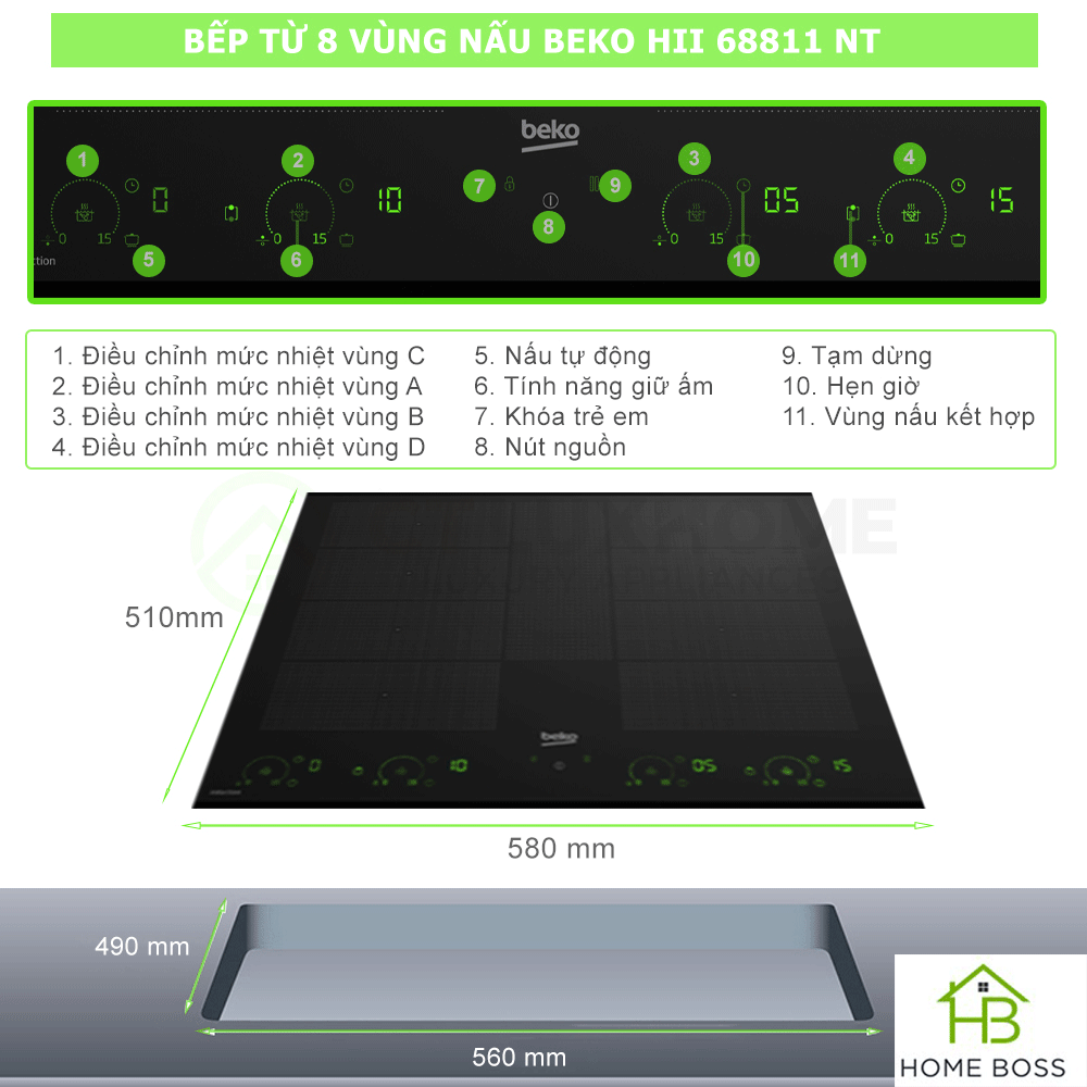 Thông số kỹ thuật chi tiết BẾP TỪ ÂM BEKO HII 68811 NT 8 VÙNG NẤU TÍCH HỢP VÙNG NẤU LINH HOẠT