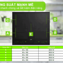 - Vùng nấu phía dưới bên phải: 2 x 90 x 180 mm – 3600W