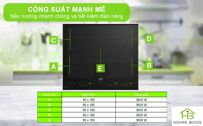 Bếp được thiết kế 4 vùng nấu riêng biệt với công suất mạnh mẽ, đáp ứng nhu cầu nấu nướng đa dạng của gia đình. Bạn có thể dễ dàng nấu nướng nhiều món ăn khác nhau cùng lúc, tiết kiệm thời gian và công sức.