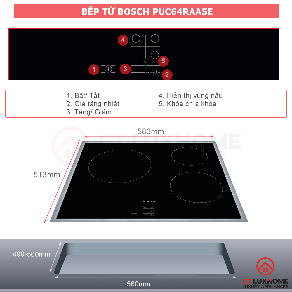 Thông số kỹ thuật chi tiết BẾP TỪ ÂM 3 VÙNG NẤU BOSCH PUC64RAA5E SERIES 2 4600W