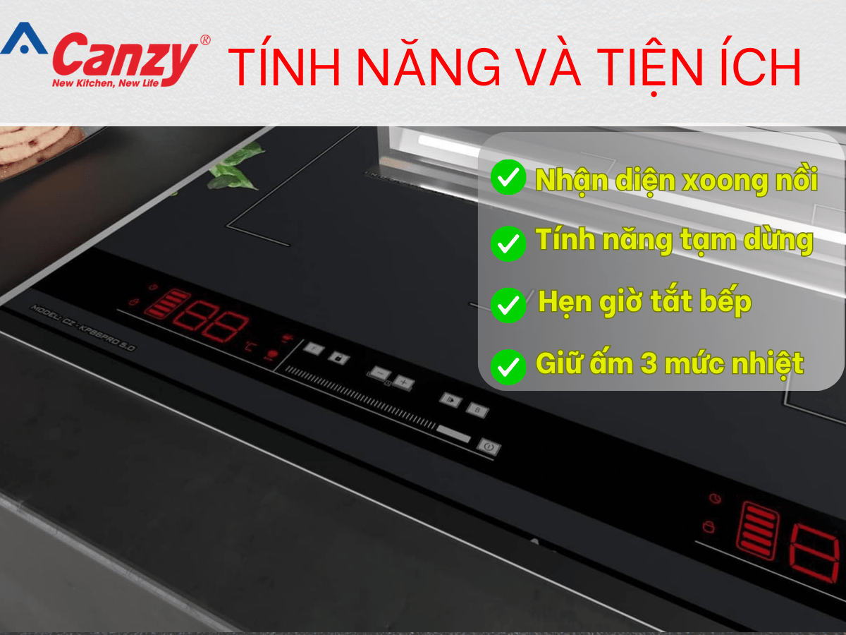 Bếp từ Canzy này còn có khả năng tự động nhận diện xoong nồi ngay khi nồi được đặt lên bếp. Bếp sẽ tự động kích hoạt vùng nấu có nồi, bạn chỉ việc điều chỉnh công suất lớn nhỏ theo ý muốn. Đồng thời, tính năng này cũng đảm bảo bếp gia nhiệt đúng vị trí mặt bếp đặt nồi, giúp nấu nướng nhanh chóng, tiết kiệm thời gian và lượng điện tiêu thụ.