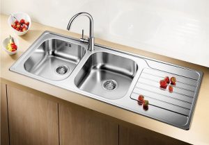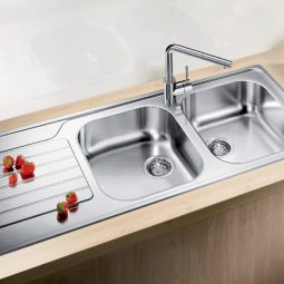 + Chậu rửa bát Blanco dinas làm bằng thép không rỉ phù hợp với hầu hết các tủ bếp