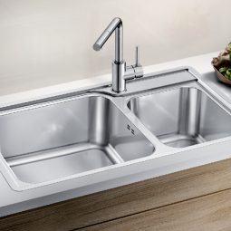 + Chậu rửa bát Blanco lemis XL làm bằng thép không rỉ phù hợp với hầu hết các tủ bếp