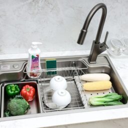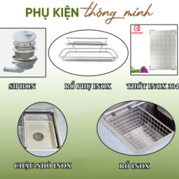 - Thiết kế hiện đại với gờ hạ bậc – tích hợp phụ kiện thông minh: xiphon, rổ inox, chậu nhỏ inox, rổ phụ inox, thớt inox