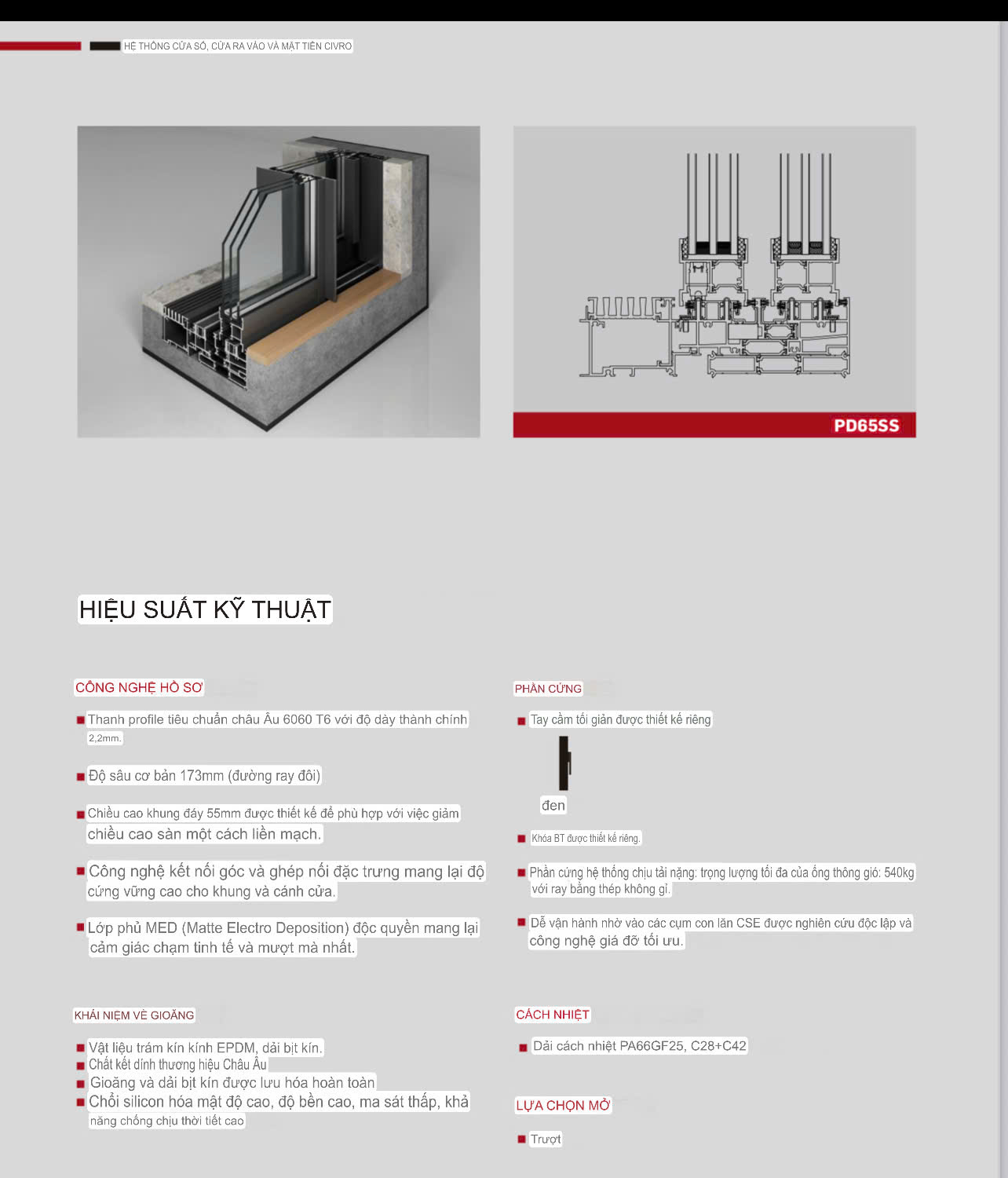 HỆ CỬA TRƯỢT CIVRO ENFINI PRO PD65 Một hệ cửa trượt không chỉ đơn thuần là thanh mảnh Hệ cửa trượt Enfini Pro PD65 sở hữu thiết kế thanh lịch, cho phép tạo ra các mảng kính lớn với phong cách tối giản. Hệ cửa nhôm trượt cao cấp này kết hợp giữa thiết kế không giới hạn và hiệu suất vượt trội. Chiều cao khung đáy 55mm được thiết kế để có thể lắp đặt sàn âm thấp, phù hợp với các công trình kiến trúc hiện đại và công trình tiết kiệm năng lượng.