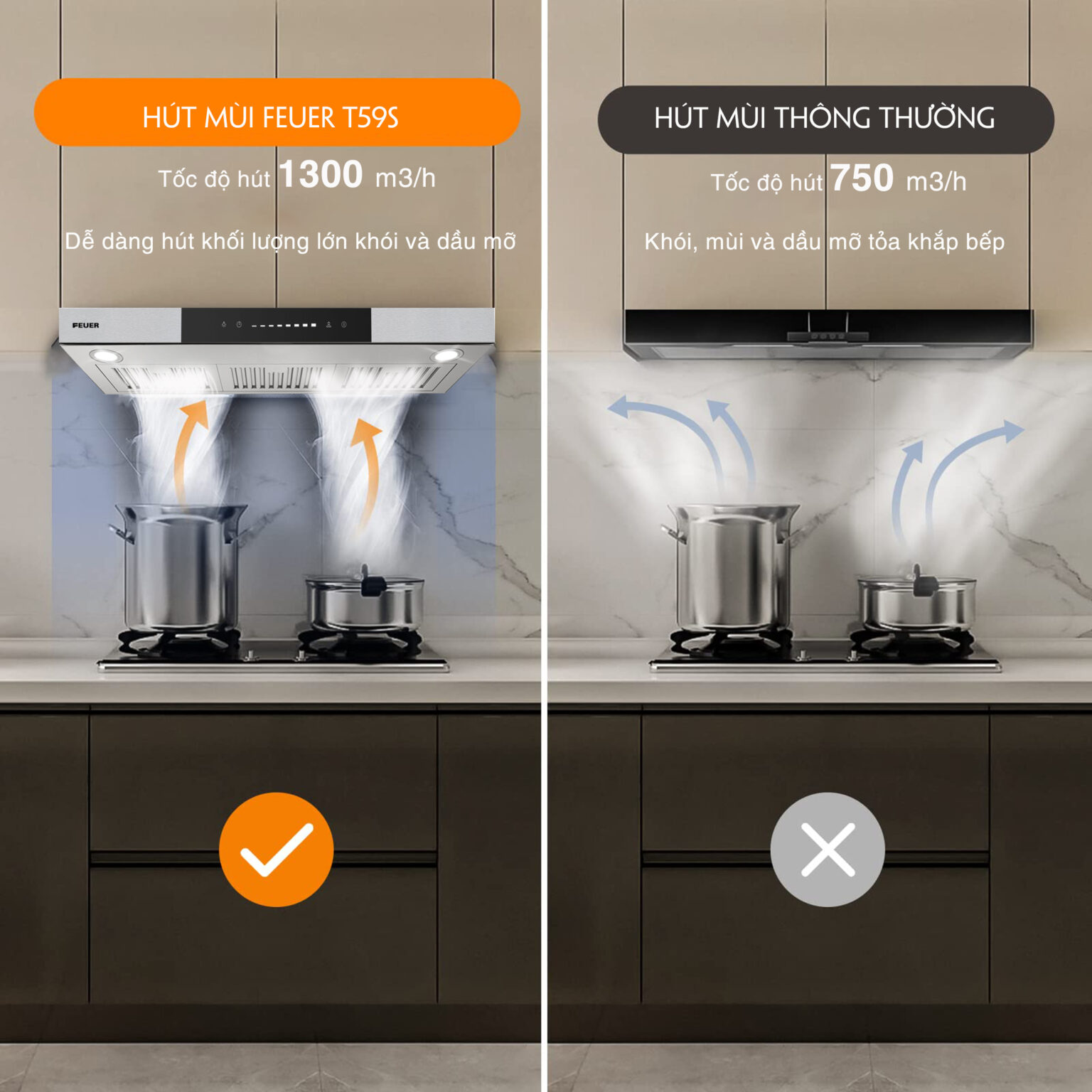 KÍCH THƯỚC HOÀN HẢO VỚI TỦ BẾP MÁY HÚT MÙI FEUER T59S