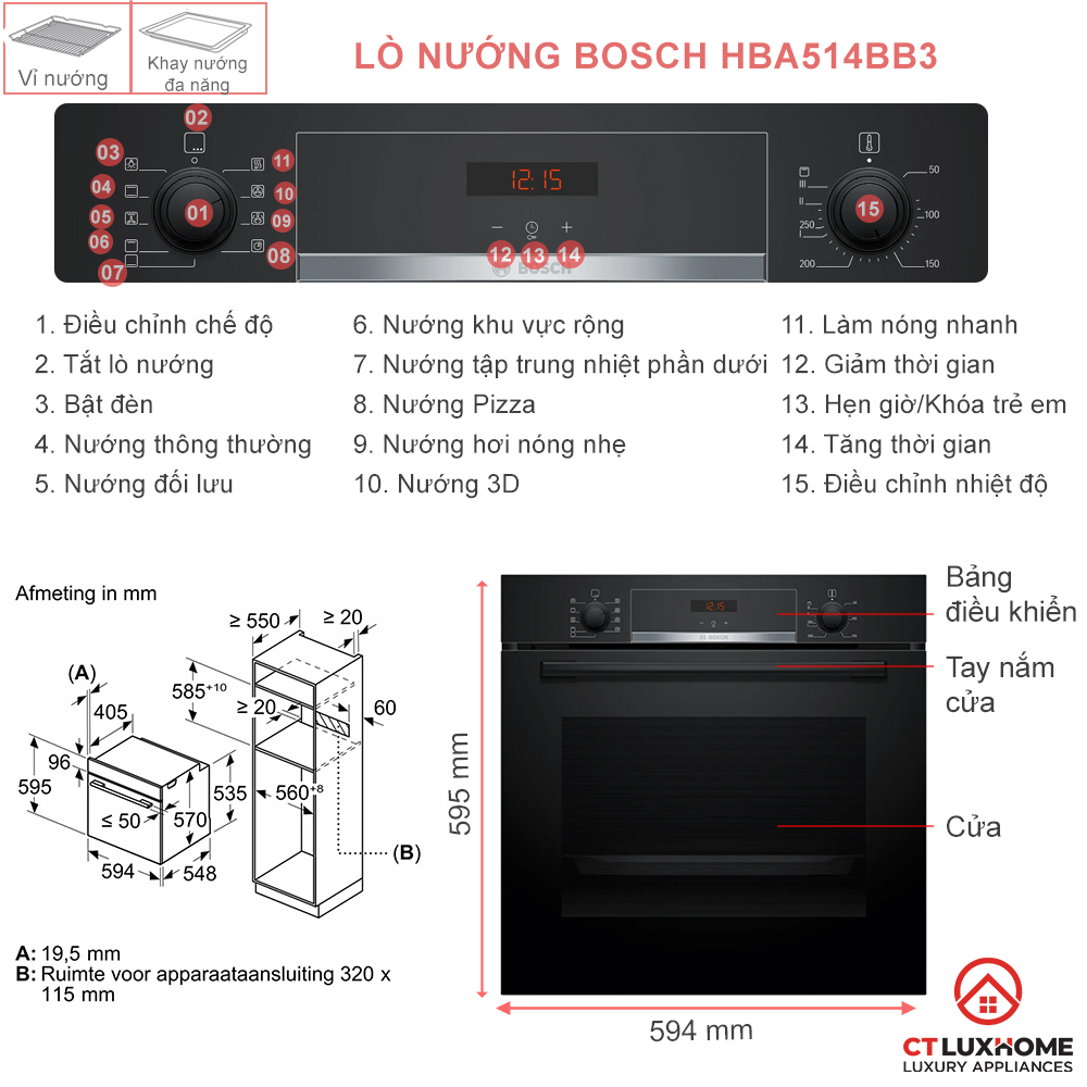 Thông số kỹ thuật chi tiết LÒ NƯỚNG ÂM TỦ BOSCH HBA514BB3 71L